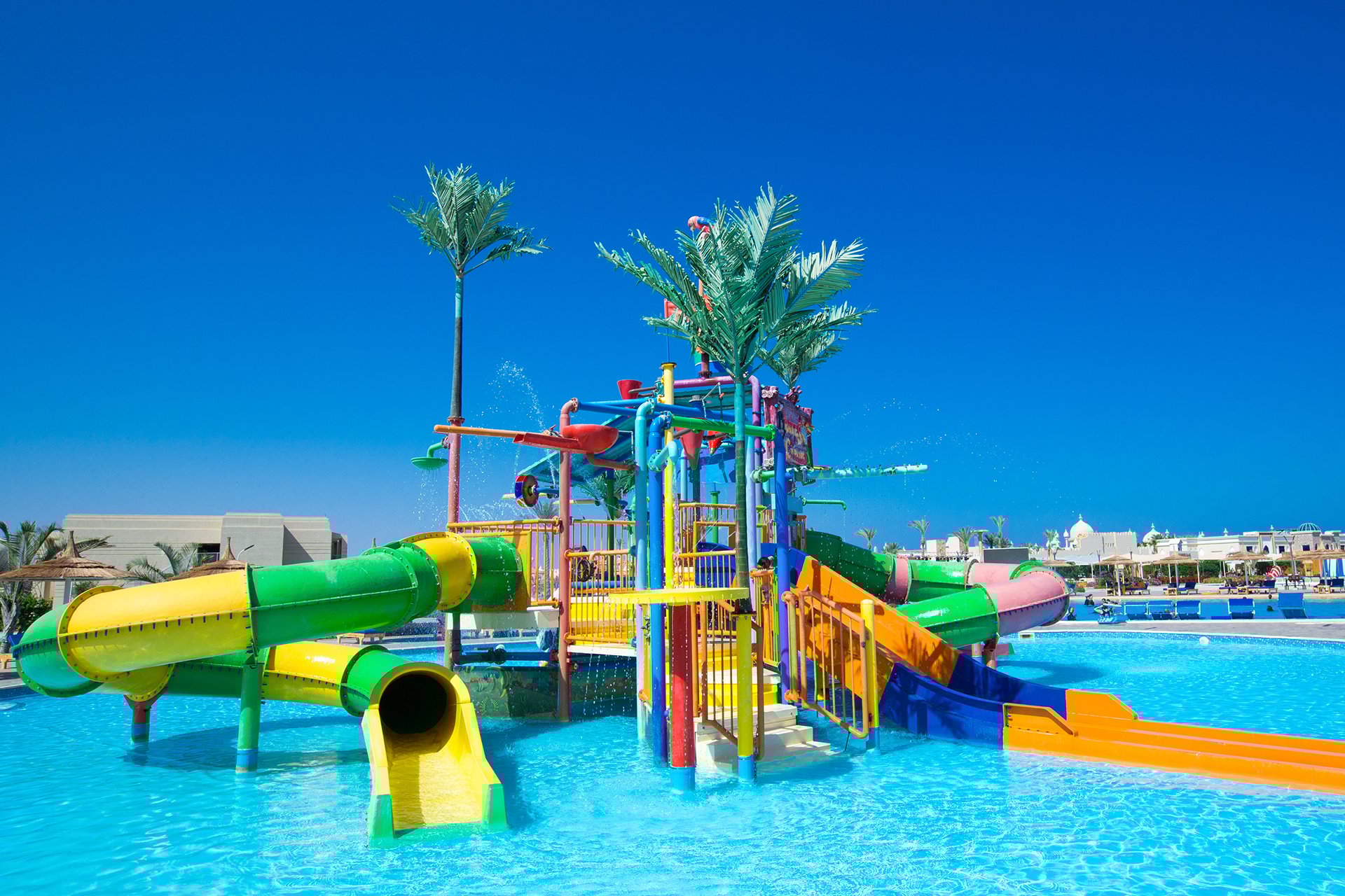 Aquapark slides in hotel complex, outdoor aqua, water park with swimming pool.extreme water slides during summer tropical vacation in Egypt, Africa.